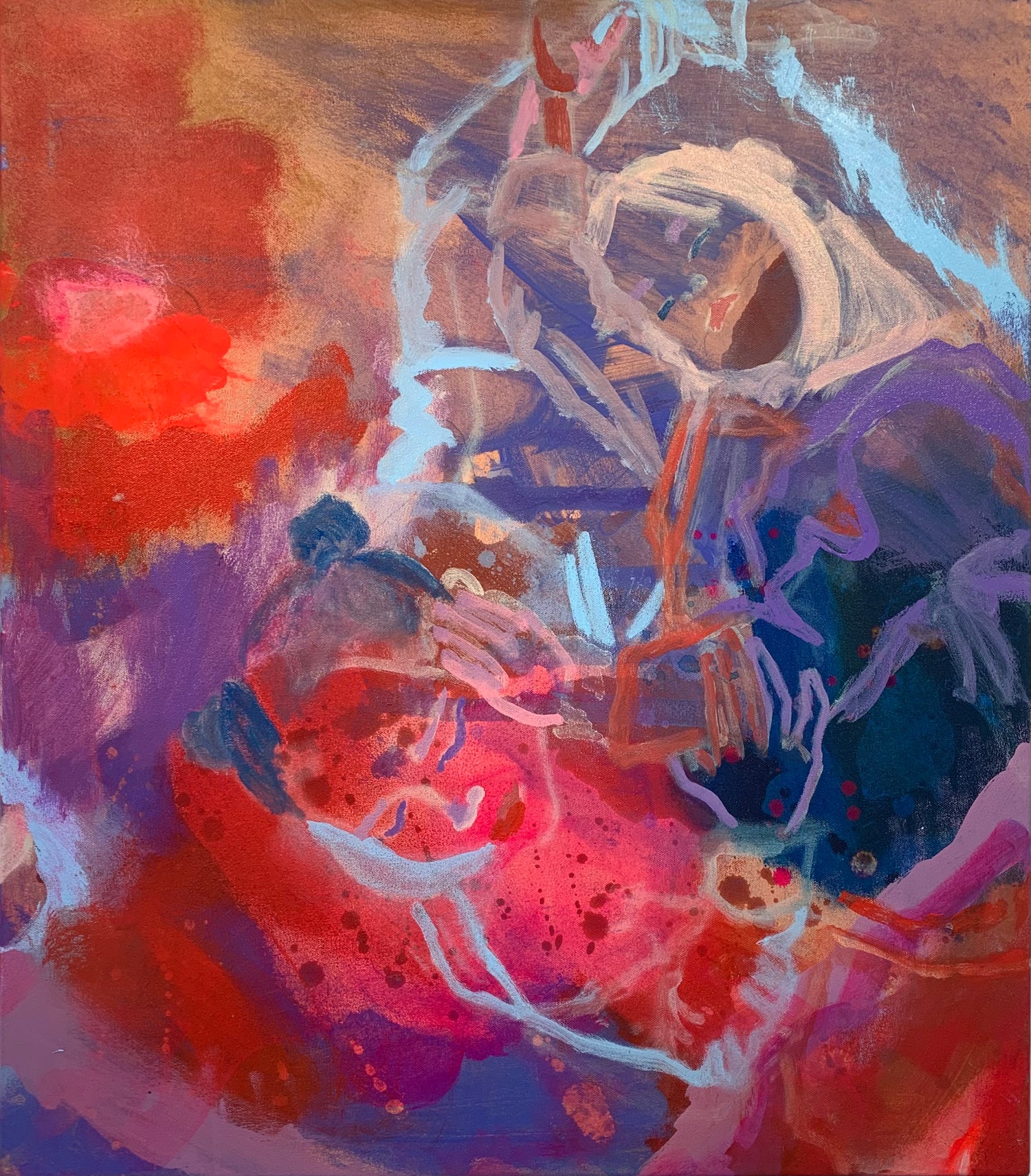 Emotions and energies become colour and movement within my work. Figures are present with their inner landscapes spilling out as they merge and join with the spaces and people around them. I use paint, colour and marks to capture the hidden depths I see and feel.